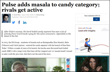 "Pulse adds masala to candy category; rivals get active."He highlights that there's a lack of brand loyalty in the category due to a low involvement price point and the distribution challenge most of the brands operating in this category face.