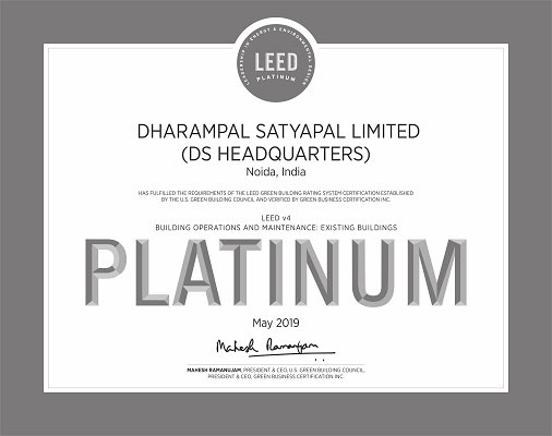 The DS Group Headquarters situated at NCR, houses the corporate office, an R&D centre and state-of-art manufacturing facilities for Confectionery, Flavours & Fragrances and Edible Gold & Silver embellishments. It has been awarded Leadership in Energy and Environmental Design (LEED) Platinum certification, under the USGBC (US Green Building Council) existing building; O&M (Operation and Maintenance) programme version 4.0 for being a green building. DSHQ is the leader amongst all LEED v4 O&M existing Buildings worldwide for two consecutive years and still holds the highest number of credits amongst existing green building projects; clearly making it a global leader. LEED is a globally recognized symbol of sustainability excellence, signifying that a building is lowering carbon emissions, conserving resources and reducing operating costs, while prioritizing sustainable practices.